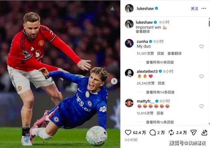 终场哨响后,没有一位曼联球员与加纳乔握手。更劲爆的是,卢克·肖在Instagram上发布了一张自己将加纳乔推倒在地的照片,并配文“重要的胜利”。曼联队长布鲁诺·费尔南德斯随即评论了一个写着“That‘s a violation”的GIF动图。这条动态7小时内就获得了7.7万次点赞。